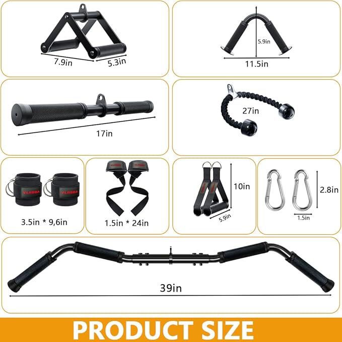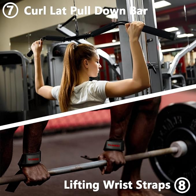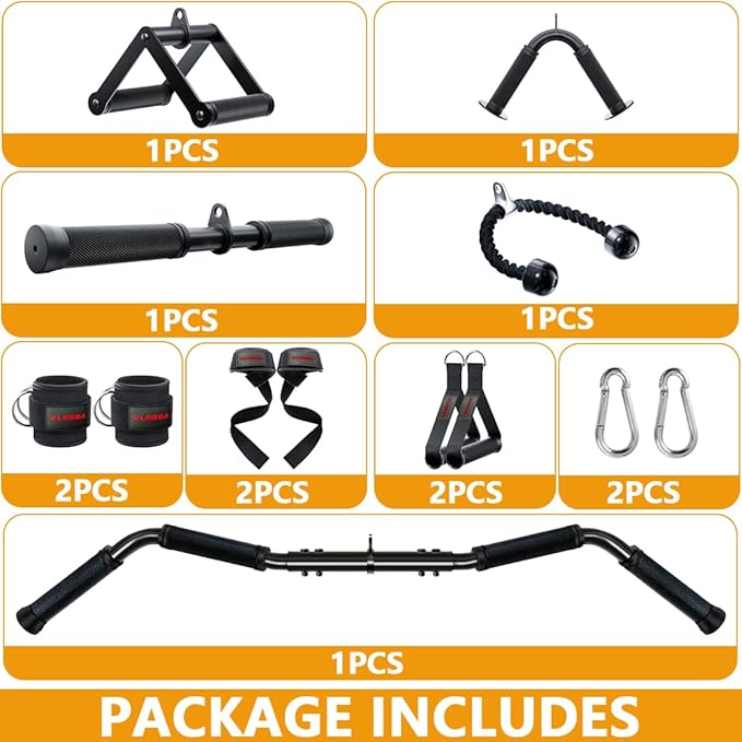- 【What is in the box】Combo Includes 1x Tricep Rope, 1x V-Handle (Double D Handle), 1x V-Shaped Bar, 1x Straight Rotating Bar, 1x Lat Pull Down Bar, 2x Lifting Wrist Straps, 2x Ankle Straps, 2x Cable Machine Handles, and 2x Snap Hooks. These home gym accessories for men and women are designed to fit most cable systems