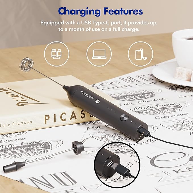 - Portable Rechargeable Design: Featuring a built-in rechargeable lithium battery, this frother eliminates the need for frequent battery replacements. Once fully charged, it offers extended use, making it perfect for enjoying your favorite frothy coffee at home, in the office, or while traveling.