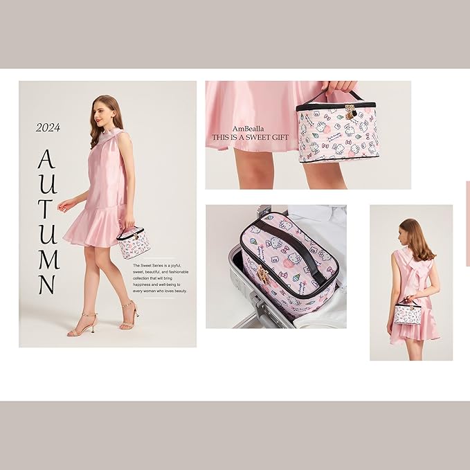 AmBealla Cosmetic Bag Large Makeup Bags Pink Travel Case with Makeup Brush Holder,Cosmetic Organizer for Women, Toiletry Bag for Skincare & Beauty Tools Sweet Cute for Girls