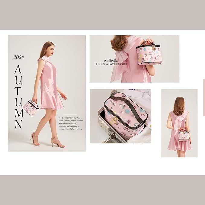 AmBealla Cosmetic Bag Large Makeup Bags Pink Travel Case with Makeup Brush Holder,Cosmetic Organizer for Women, Toiletry Bag for Skincare & Beauty Tools Sweet Cute for Girls