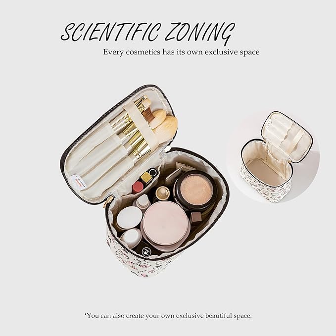 - Separate Brushes Compartment - Travel makeup bag comes with a separate space to hold your brushes and protect them from dust.The large independent space in the middle can accommodate your daily cosmetics.There is an independent side pocket inside for lipstick, small perfume, jewelry, etc, which is very practical