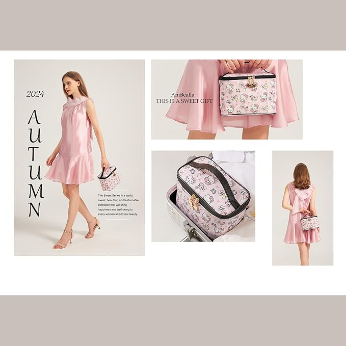 AmBealla Cosmetic Bag Large Makeup Bag Pink Makeup Travel Case with Brush Holder, Canvas Organizer for Women, Toiletry Bag for Skincare & Beauty Tools Sweet Cute for Girls
