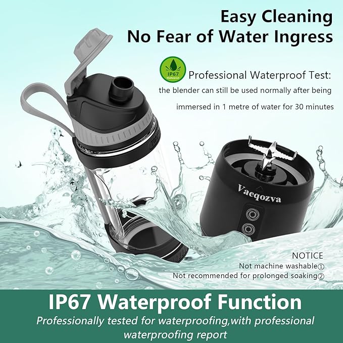 - WATERPROOF & EASY TO CLEAN: The Vaeqozva small smoothie blender is IP67 waterproof,double-click to turn on the self-cleaning mode,or just rinse mini blender with water,which makes it very easy to clean. Tips:Don't immerse the portable blender in water