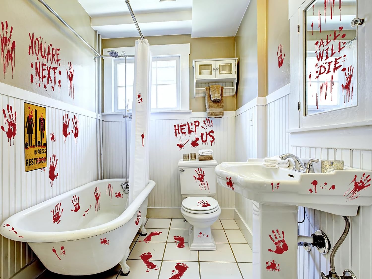 - What You’ll Get: 12 Halloween window clings, including 1 "Help Us" sticker, 9 realistic bloody handprint clings, and 2 bloody footprint stickers. Each features a vivid red color and detailed splatter design to enhance the spooky feel of your decor. Perfect for creating a creepy atmosphere at home or making a bold statement at a party, these decals are must-have elements to elevate your Halloween setup!