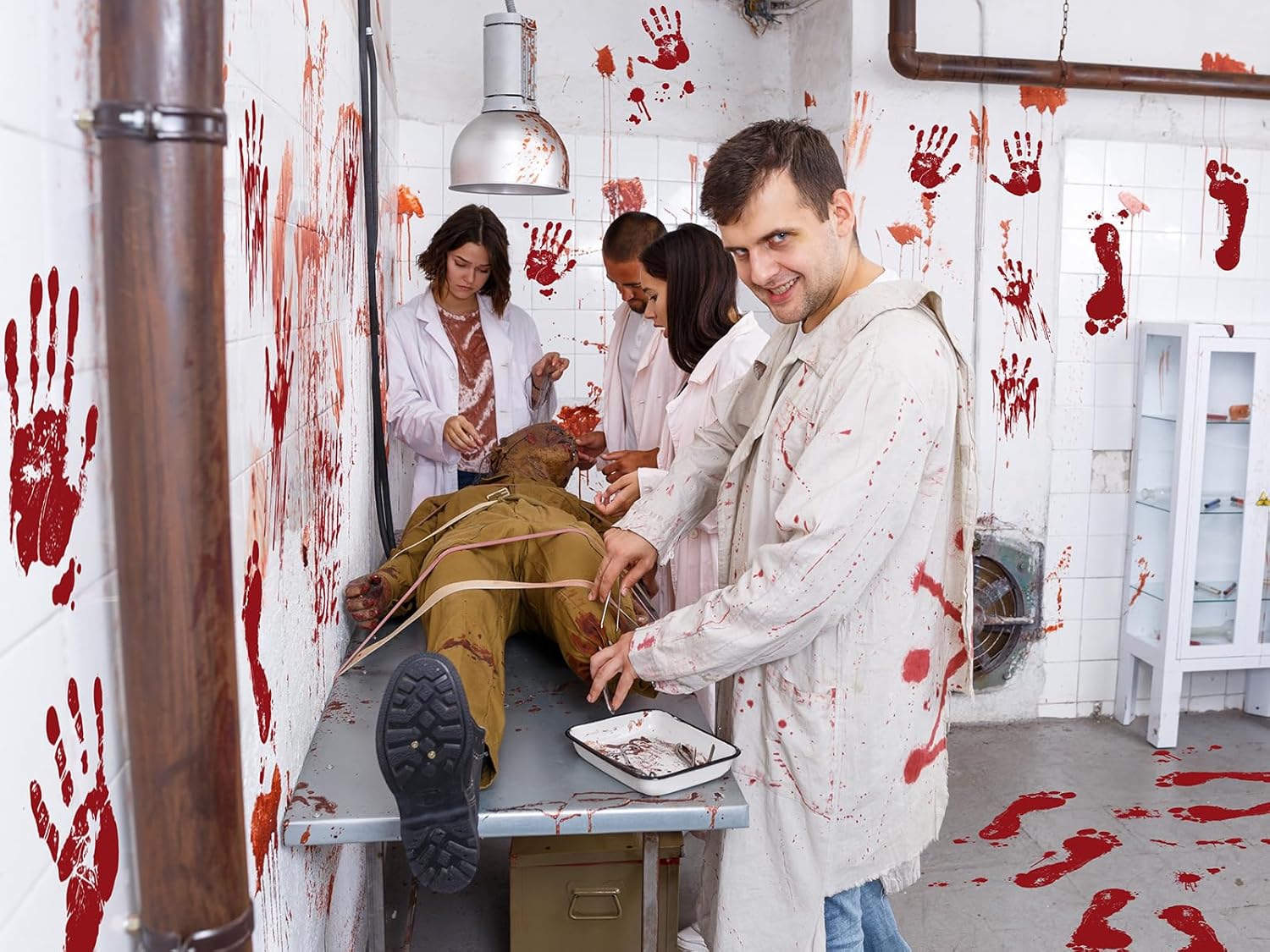 - The Perfect Spooky Party Decoration:On a dark Halloween night, these bloody decals create a scene straight out of a horror movie. The smeared bloody handprints and "Help Us" signs on your windows make your home look like the site of a terrifying event. Neighbors passing by or friends dropping in will be captivated by these realistic blood stains, thinking they’ve stumbled upon a chilling scene! Imagine the look of shock on their faces—that's the mark of a successful Halloween party!