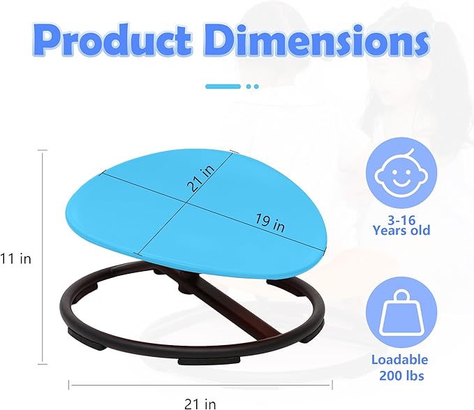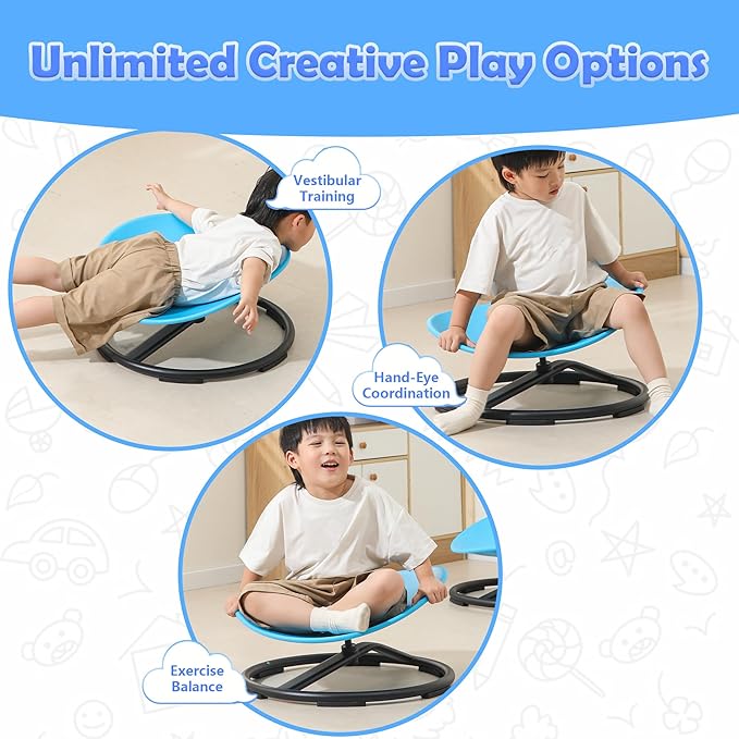 - erfect Gift for Special Occasions: A fantastic gift choice for birthdays, Christmas, and other special occasions, these spinning chairs for kids offer endless entertainment while supporting their developmental growth in balance, coordination, and sensory skills. This sensory swivel chair provides an engaging experience, making it a wonderful gift for children.