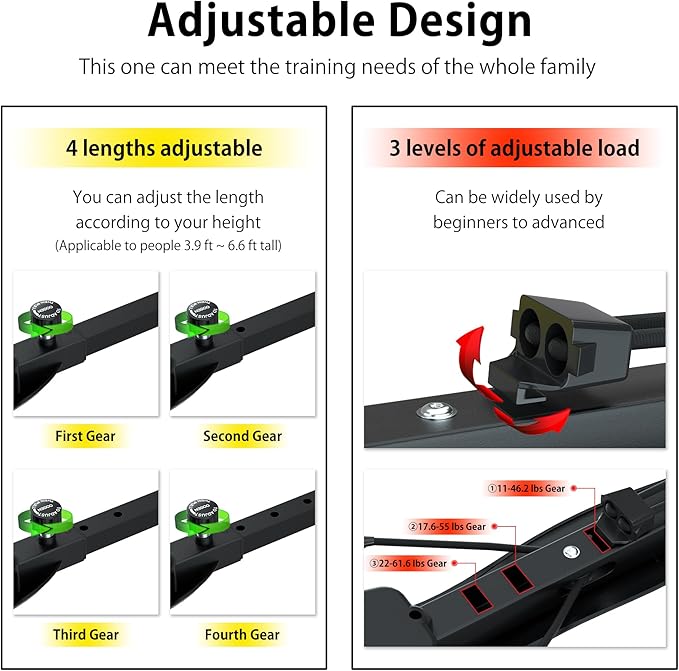 - Adjustable Load and Length: Easily adjust the load and length to match your fitness level. Suitable for everyone, from beginners to advanced users, including women and family members