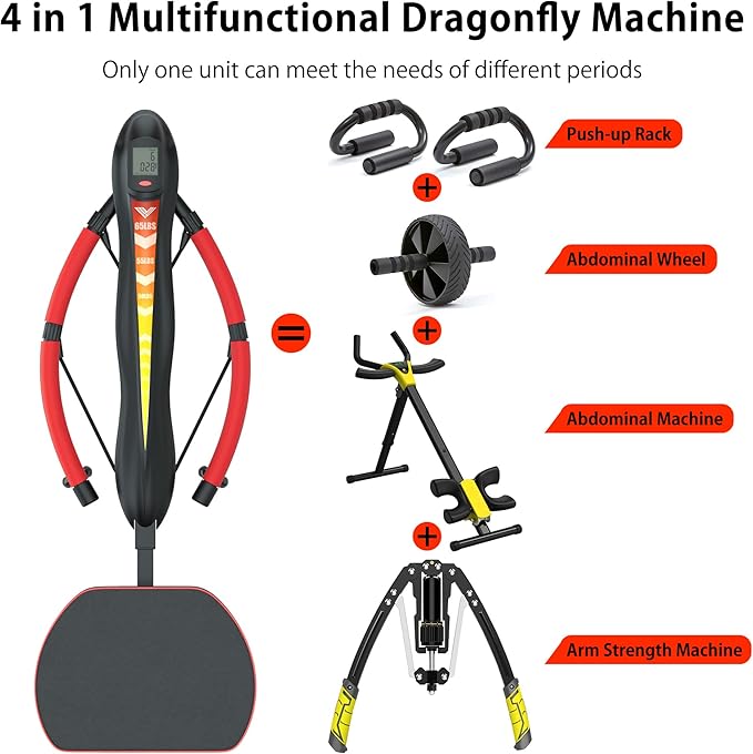 - 4-in-1 Multi-Function Fitness Equipment: This versatile dragonfly machine combines a push-up bar, ab roller, abdominal trainer, and muscle training armbar in one, catering to various workout preferences and ideal for all training enthusiasts