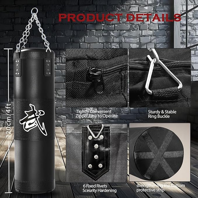 - 【Upgraded Model】The punching bag is attached to the heavy boxing bag using 6 rivets and double stitching on the sides, three reinforced bottom protection straps are added to the bottom of the punching bag.