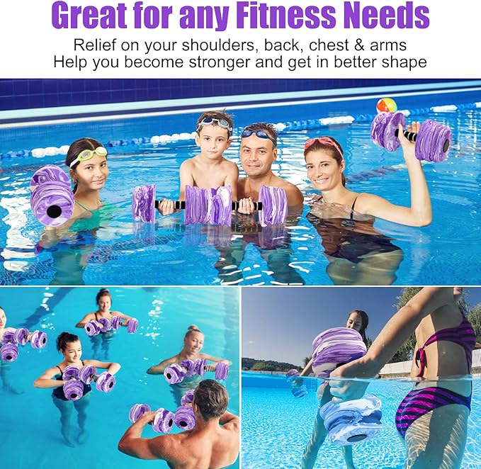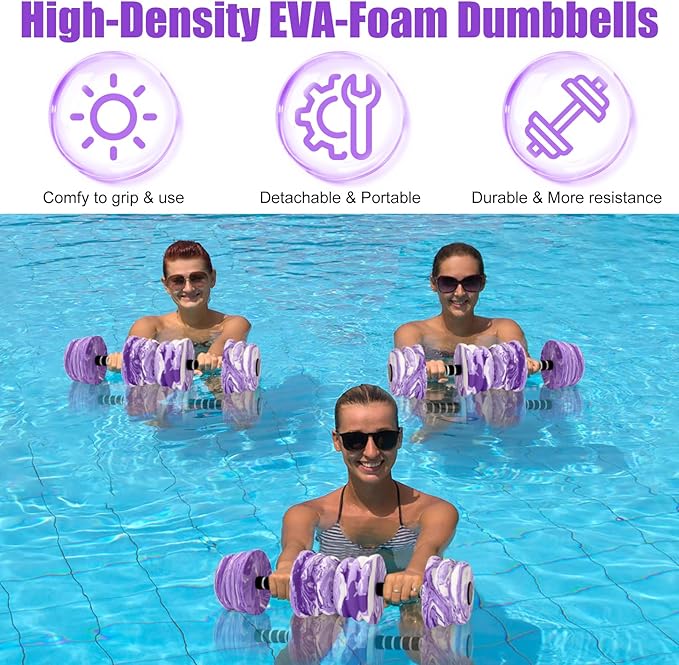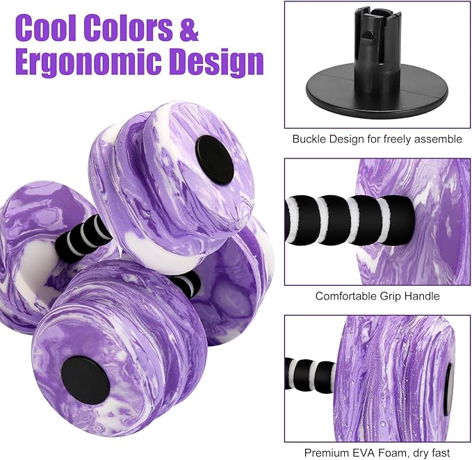 - Perfect Aquatic Fitness Tool - The aquatic dumbbells for water aerobics is designed in Cool Colors & Ergonomic Design. EVA foam cushion padded around the hand bar, offering a more comfortable & anti-slip grip. Large diameter makes it more easier to use. Buckle Design is for freely assemble .