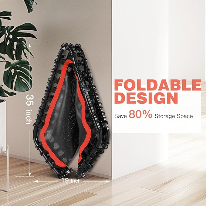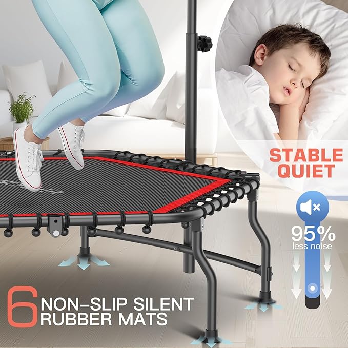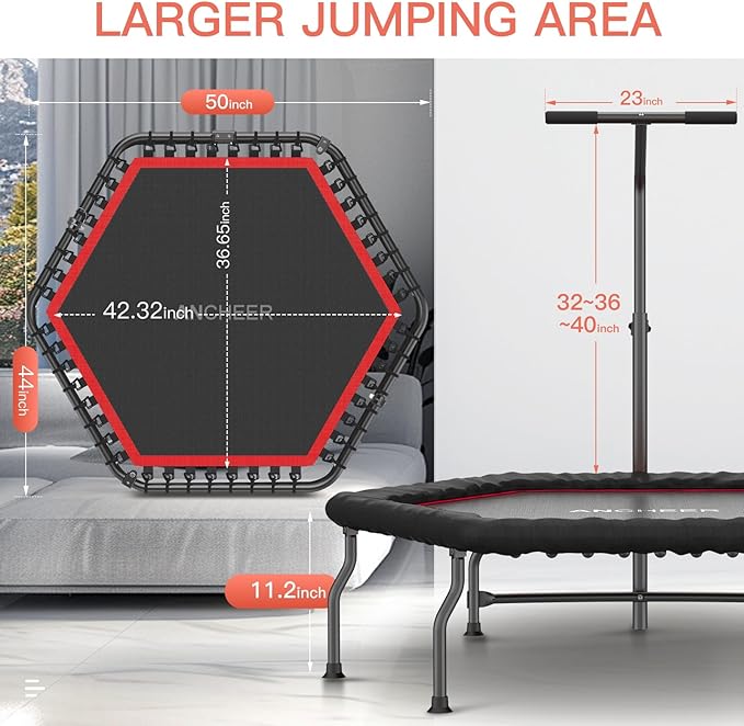 - 【Ultra Quiet】 The 50" mini trampoline features a sturdy bungee design. Say goodbye to the noise of metal springs. We provide you with 6 removable rubber feet to reduce noise, avoid slipping and protect your floor. The included bungee mat outer layer reduces noise and the risk of stepping on bungee cords while bouncing. You can feel that every part of the ANCHEER trampoline has stood the test of time and will last a lifetime.