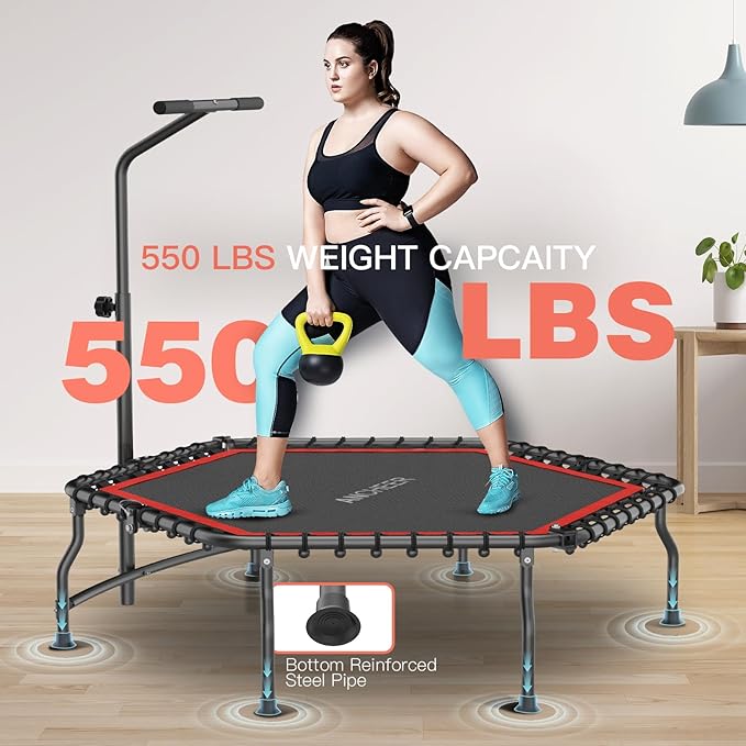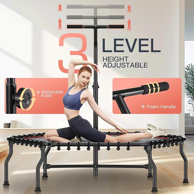 - 【3 Levels Adjustable Handle】3 levels of height adjustable handle (up to 50 inches), suitable for adults and teenagers. Foam-covered handrails prevent sweat from corroding the handles, which enhances balance, flexibility and coordination. Removable handrail bars are designed for easy carrying and storage of the trampoline. Maximum weight capacity 550 lbs.
