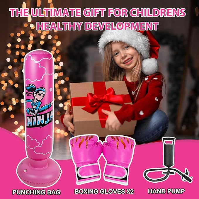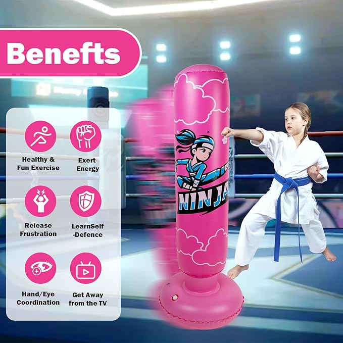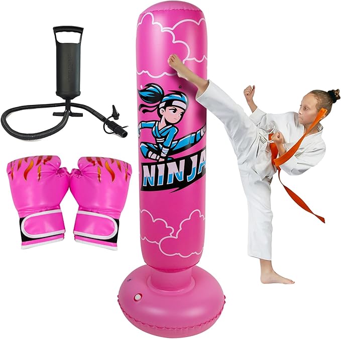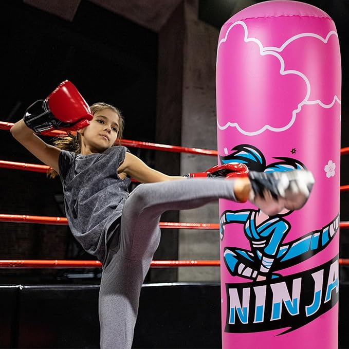 - LARGER KIDS BOXING BAG GIFT SET: When you purchase our kids ninja boxing set,You get a hand inflation pump,A pair of boxing gloves,A 67" ninja inflatable kids boxing bag,and two patches.Our boxing bag is 67" (H)/168 cm (inflated).Weighs only 3.2 lbs/1.45kg.Lightweight and easy to move.Perfect for kids ages 5-12 years old!