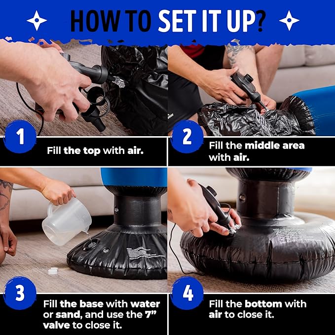 - Effortless Setup & Storage: The punching bag with stand is easy to inflate and deflate using the included electric air pump with 2-in-1 functionality for home and car use. Deflate and store it away in minutes, making it perfect for any home with limited space or for taking along on family trips