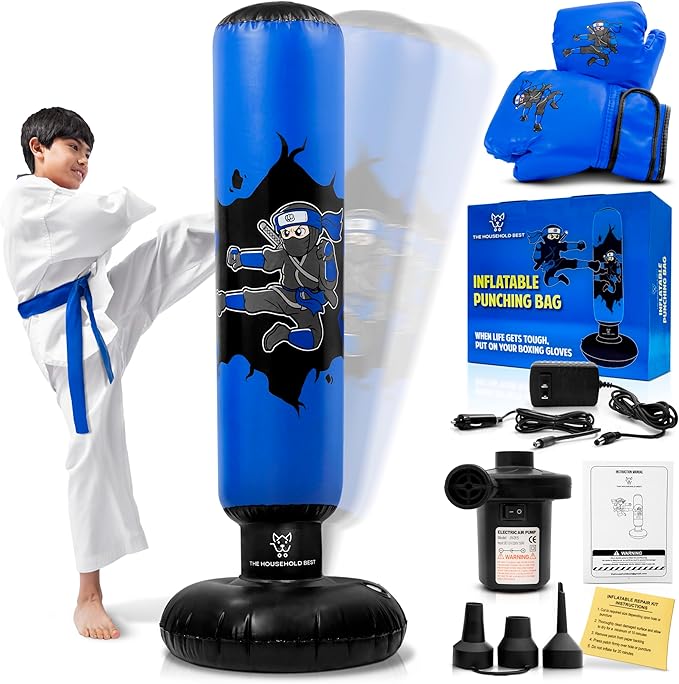 THB Punching Bag for Kids - Inflatable Punching Bag Stand with Boxing Gloves for Kids Age 3-8, 63” Ninja Boxing Bag with Electric Air Pump to Practice Taekwondo, Karate, MMA, Bouncing Back Boxing Set