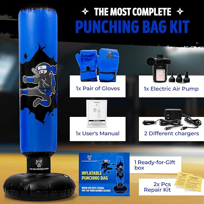 - Complete Package for Hours of Fun: Your purchase includes a standing punching bag, a pair of kids boxing gloves for 3-8 years, an electric air pump (AC 230V – 50W) for quick inflation at home or on the go, 2 pcs repair kit for added durability, a user manual, a thank-you card, and a beautifully designed gift box – perfect for gifting or easy storage