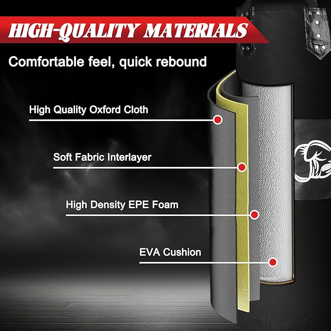 - 【High-quality Materials】This professional punching bag adopts a four-layer composite structure, and each layer is carefully designed: high-quality Oxford cloth, soft fabric interlayer, high-density EPE foam, EVA pad. It can resist tearing, rebound quickly, effectively reduce the impact force generated during boxing, provide the best protection for your hands, and ensure that you can box confidently! Use our punching bag to challenge yourself, break through your limits!
