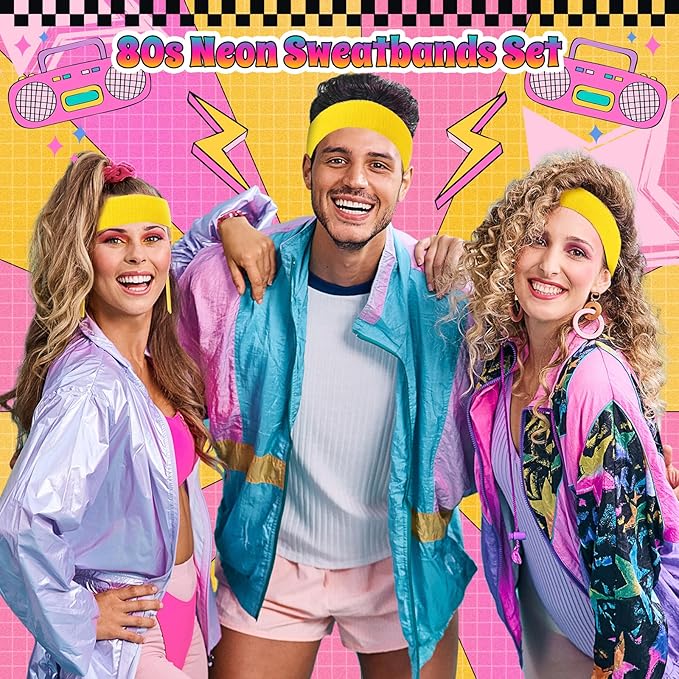 - 80S Sweatbands: go all out! This 80s sweatband set includes a neon headband and two neon wristbands for men and women that doubles as 80s costume, fitness, running or exercise gear; Fun 80s party accessories for many 80s event that also suitable for your neon party