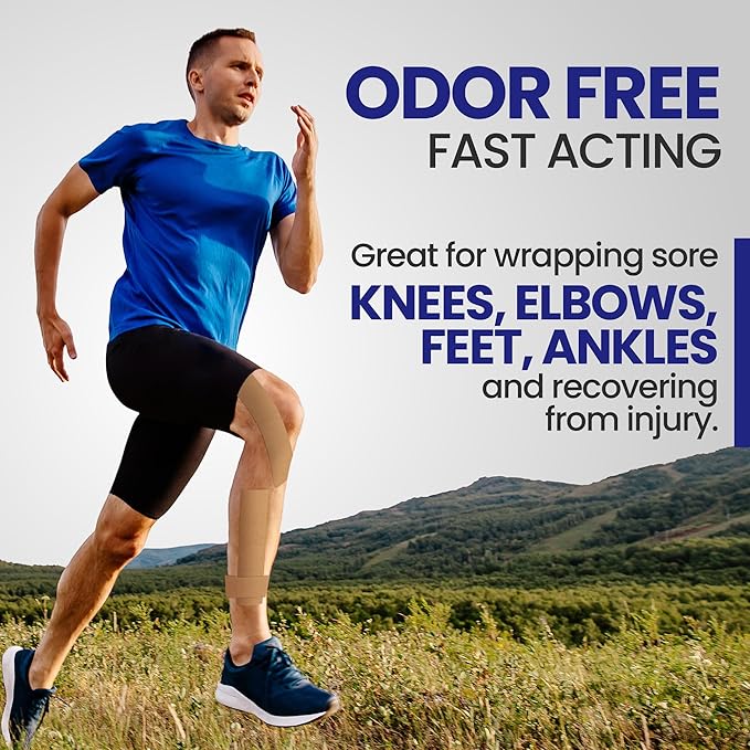 - EASY TO APPLY AND STAYS ON — Great for wrapping sore knees, elbows, feet, and ankles, the 2 inch by 10 inch tape strips are built on kinesiology cloth to move with you throughout all activities and will not fall off like other patches and gels. Its industry-proven adhesive materials are safe for everyone and stay on for up to 12 hours while recovering from injury.