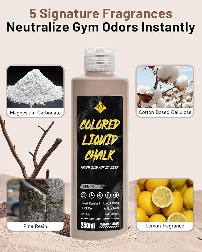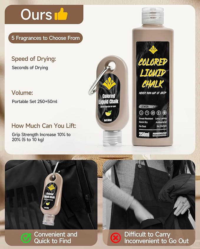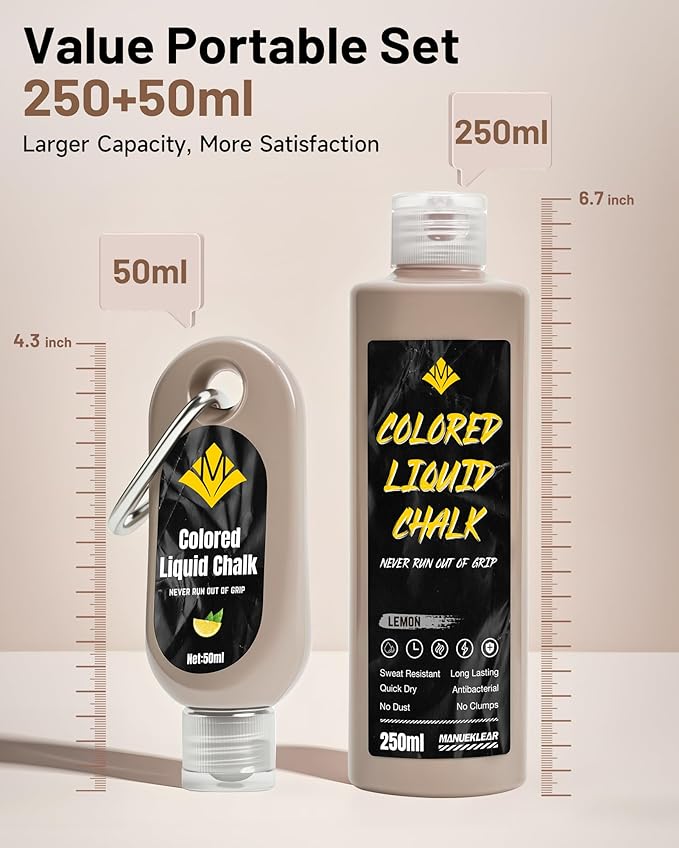 - ๐ ๐ซ๐๐ฌ๐ก ๐๐๐๐ง๐ญ๐ฌ & ๐๐จ๐ซ๐ญ๐๐๐ฅ๐ ๐๐จ๐ง๐ฏ๐๐ง๐ข๐๐ง๐๐: MANUEKLEAR Liquid Chalk includes a 250ml bottle plus a handy 50ml travel size. Choose from refreshing blueberry, lemon, or mint scents for a fresh experience. The small bottle clips with a carabiner onto your bag or gear, making it perfect for workouts at the gym, home, or on the go๏ผ