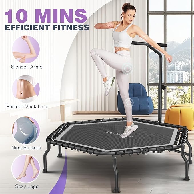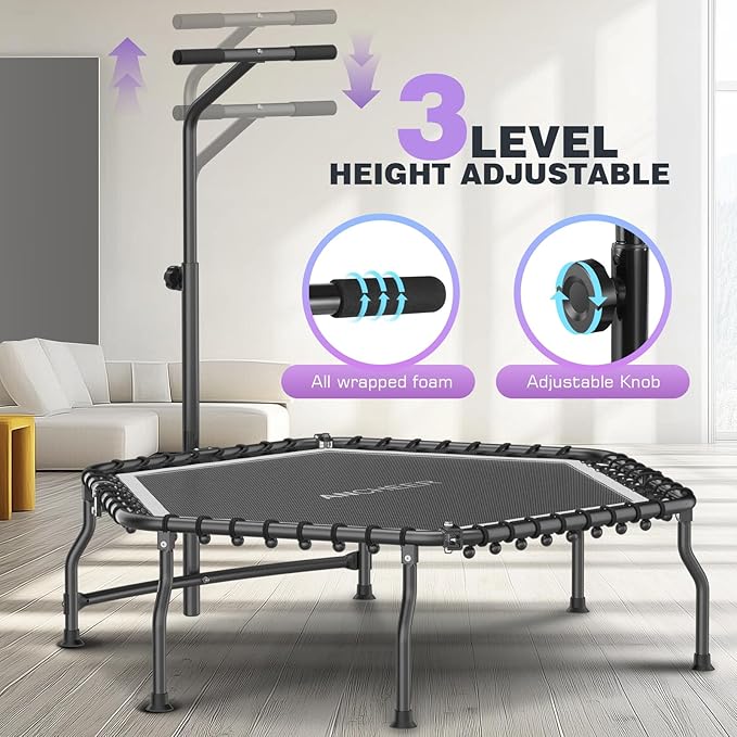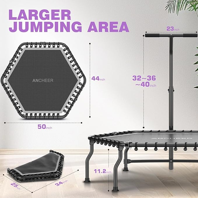 - 【 Adjustable Handlebar for Versatile Use】The Ancheer rebounder trampoline for adults with bar comes with a heavy-duty handlebar that features 3 adjustable height levels (35'' to 50''), making it suitable for people of varying heights. Whether you're doing light exercises or intensive workouts, the handlebar adds stability and control, allowing you to tailor your fitness routine with ease. This flexibility ensures the workout trampoline is ideal for a wide range of the whole fitness goals.