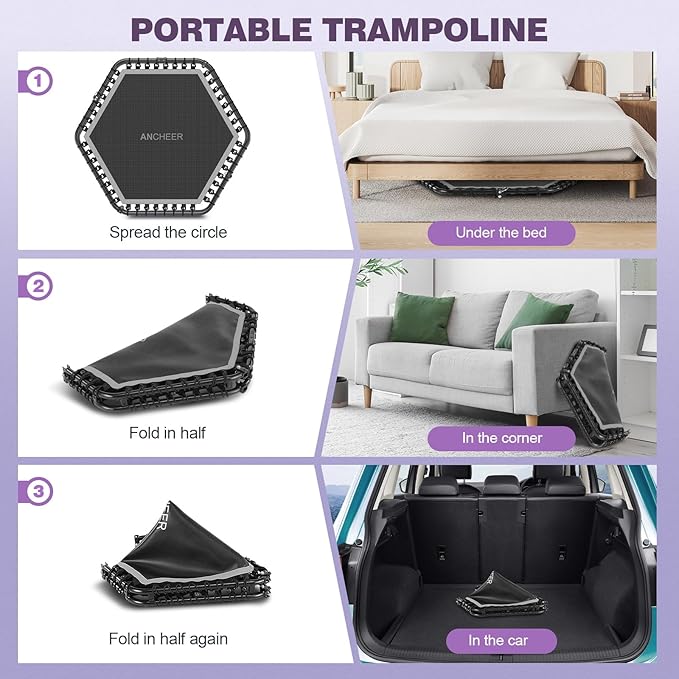 - 【Space-Saving Foldable Design】Ancheer foldable trampoline features a unique foldable design, allowing it to be reduced to less than a quarter of its full size. This makes it easy to store in tight spaces such as under the bed, behind the sofa, or even in the trunk of your car. The compact storage option means you can enjoy a full workout without worrying about space limitations. Perfect for apartments or anyone with limited storage. ⚠️Note: Need to remove handles and legs before folding.
