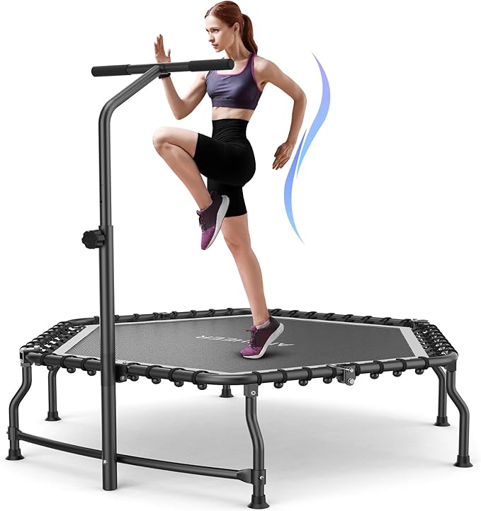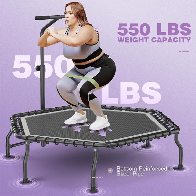- 【 Multifunctional Fitness Partner】With a large 50-inch hexagonal jumping surface, this trampoline for adults is perfect for a wide range of exercises, including yoga and other high-intensity aerobic routines. It helps improve muscle tone, coordination, and strength, making it an excellent choice for full-body workouts. Whether you're aiming to enhance your core strength or cardiovascular endurance, this indoor trampoline offers a versatile fitness solution.