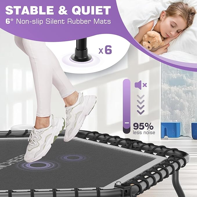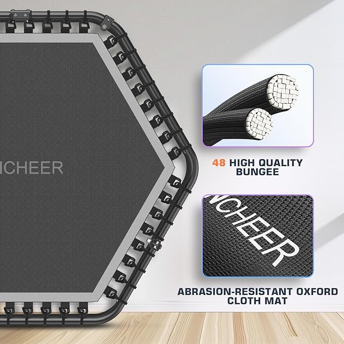 - 【High-Quality Materials & Enhanced Safety】The Ancheer indoor trampoline adults is built with a heavy-duty steel frame, ensuring long-lasting durability. The waterproof jump mat is secured with sturdy bungee cords, providing superior stability during use. With 48 high-strength bungee cords, you’ll experience smooth and supported jumps without hitting the ground. Rigorously tested for thousands of jumps, this exercise trampoline is designed to offer both safety and reliability for long-term use.