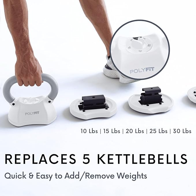 - EASY TO ADJUST | 5 KETTLEBELLS IN 1. The user-friendly design of the Polyfit kettlebell allows you to change the weight settings in seconds, providing a seamless transition between exercises without interrupting your workout flow. The kettlebells feature 5 accurate weight adjustments, allowing you to progressively challenge yourself as you advance in your fitness journey.