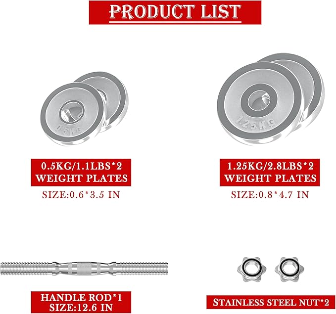 - 【Package List】- Package included 1x dumbbell bar, 2x nuts, 2 x 1.1-pound plates, 2 x 2.8-pound plates.