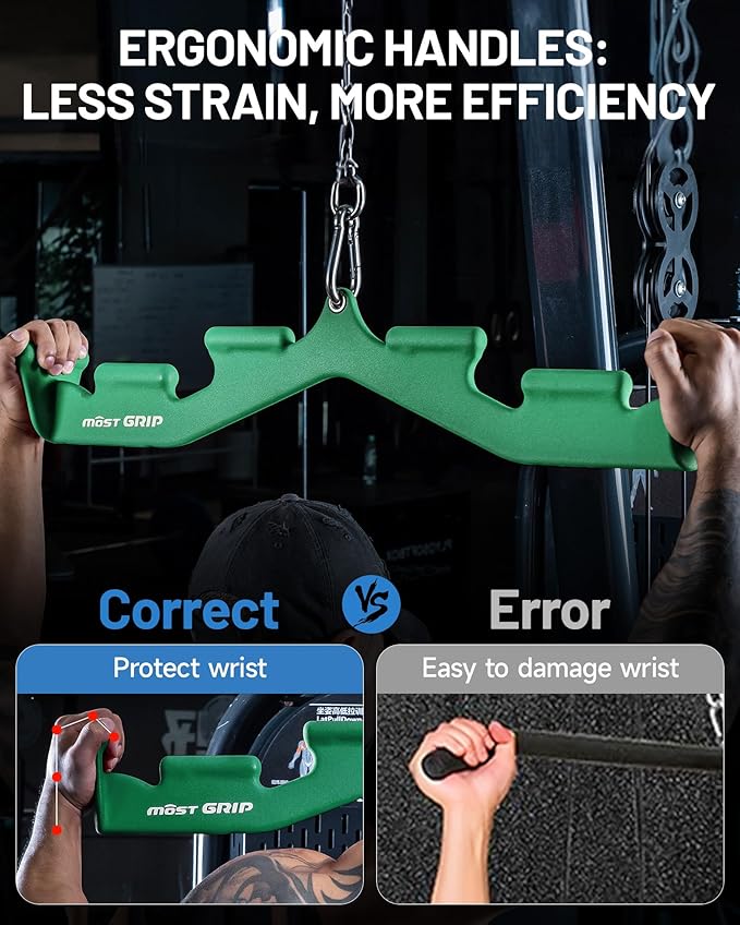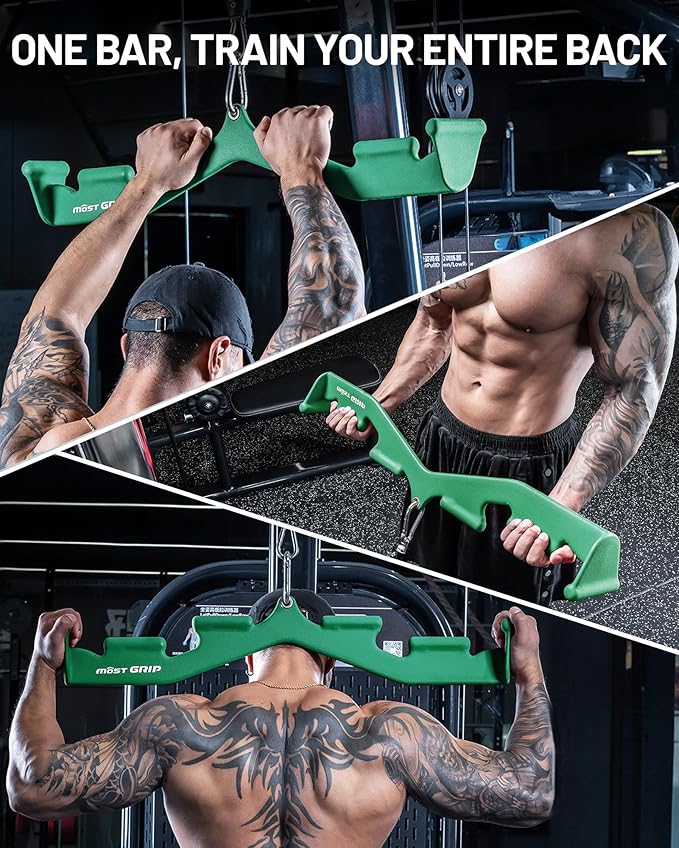 - đŞ Versatile 3-Grip Design for Total Back Development: Maximize your back workouts with the MOST GRIP Lat Pull Down Bar (Registration in process: US 29/959,858). With three grip positionsâwide, narrow, and neutralâyou can effectively target the lats, rhomboids, and teres for a complete upper body workout. Say goodbye to boring routines! This bar enhances back, biceps, and triceps, giving you a versatile workout in one tool.
