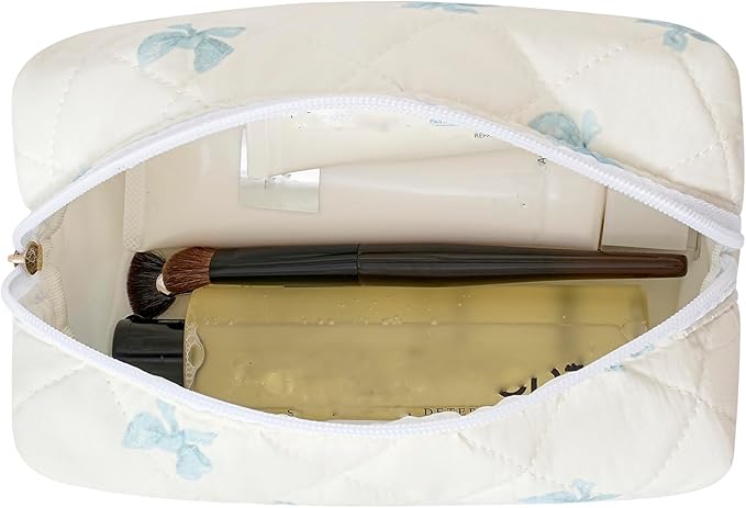 Quilted Cotton Makeup Bag Travel Cosmetic Bag for Women Girls, Zipper Make Up Pouch, Bow Pattern Toiletry Organizer Makeup, Portable Storage Bag (Blue Bow Tie)