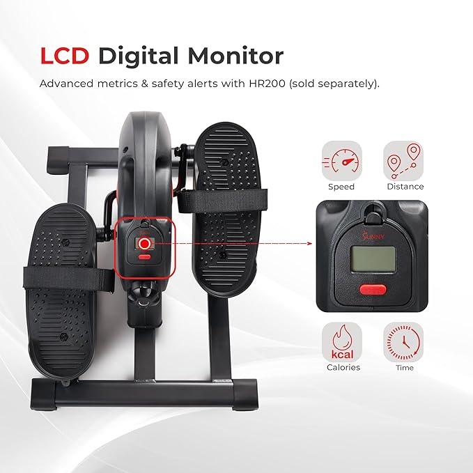 - 【DIGITAL MONITOR & ENHANCEABLE METRICS】Track real-time speed, time, calories burned, and distance with the digital monitor. Upgrade to the Sunny HR200 heart rate monitor (sold separately) to track your pulse with color-coded indicators: red for exceeding range, green for efficiency, and yellow for intensity.
