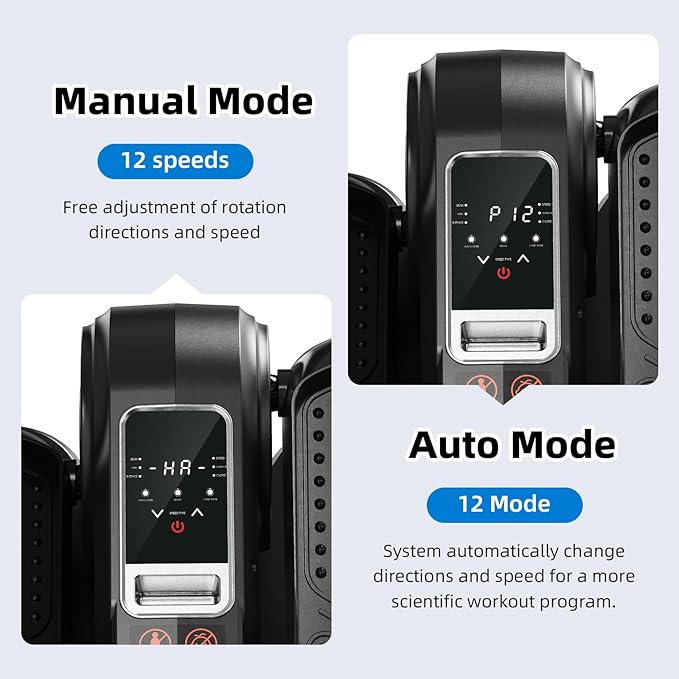 - 【Auto & Manual Exercise Mode】Our under desk elliptical machine has two motion modes:automatic mode (P1-P12) and manual mode (12 speed). You can not adjust the time, speed and direction when it is automatic program state. You need to set it to manual mode to adjust it.The pedals can move forward or backward, enabling you to target a variety of muscle groups. You can adjust the speed to achieve the results you need such as strengthening your legs and losing weight etc. (only in manual mode)