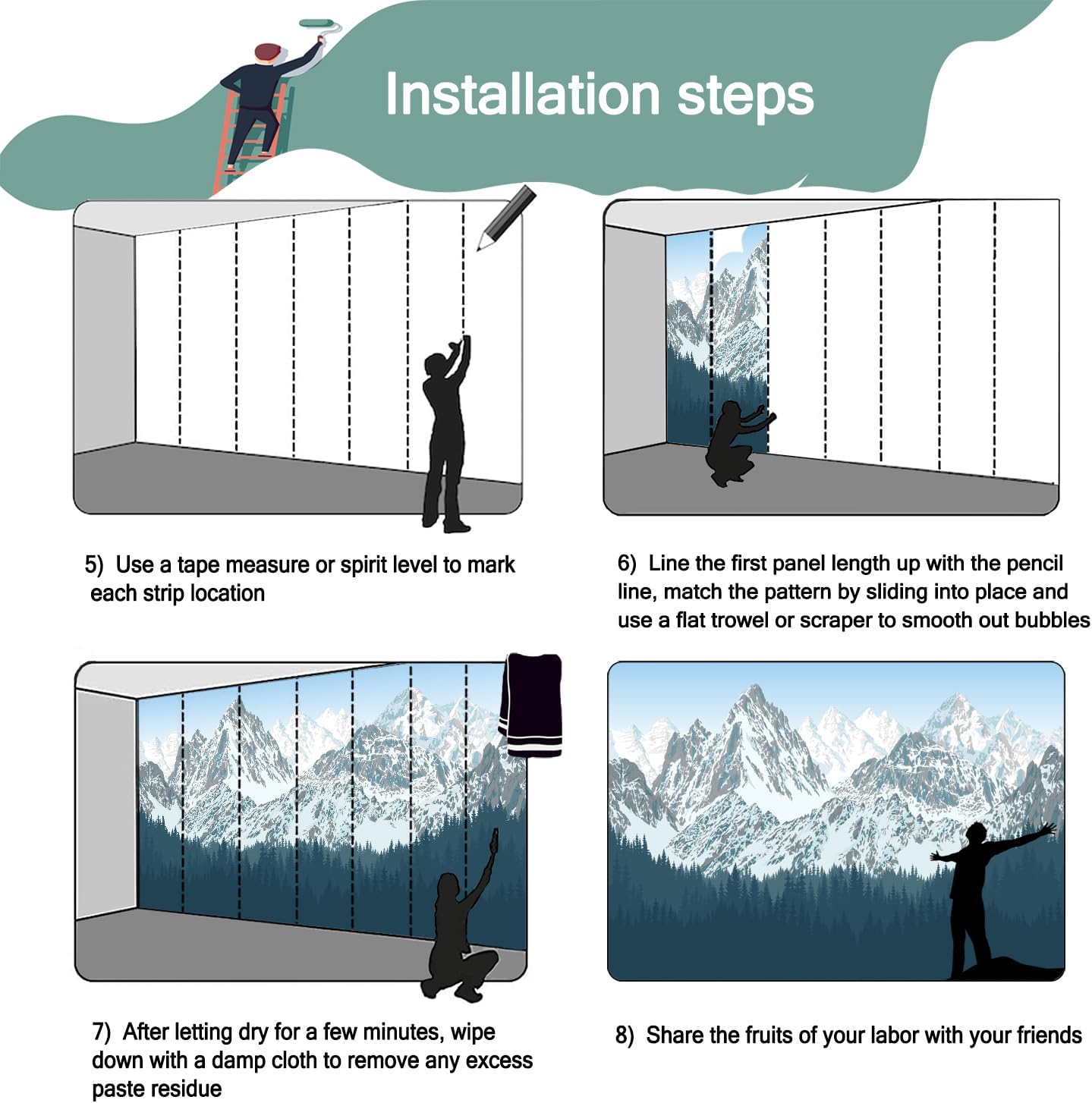 - Mural wallpaper size: 140 "W x 91 "H, divided into 7 sections, each section is labeled with a number underneath, there is no need to overlap the pattern when installing, just install according to the number labeled underneath the panel