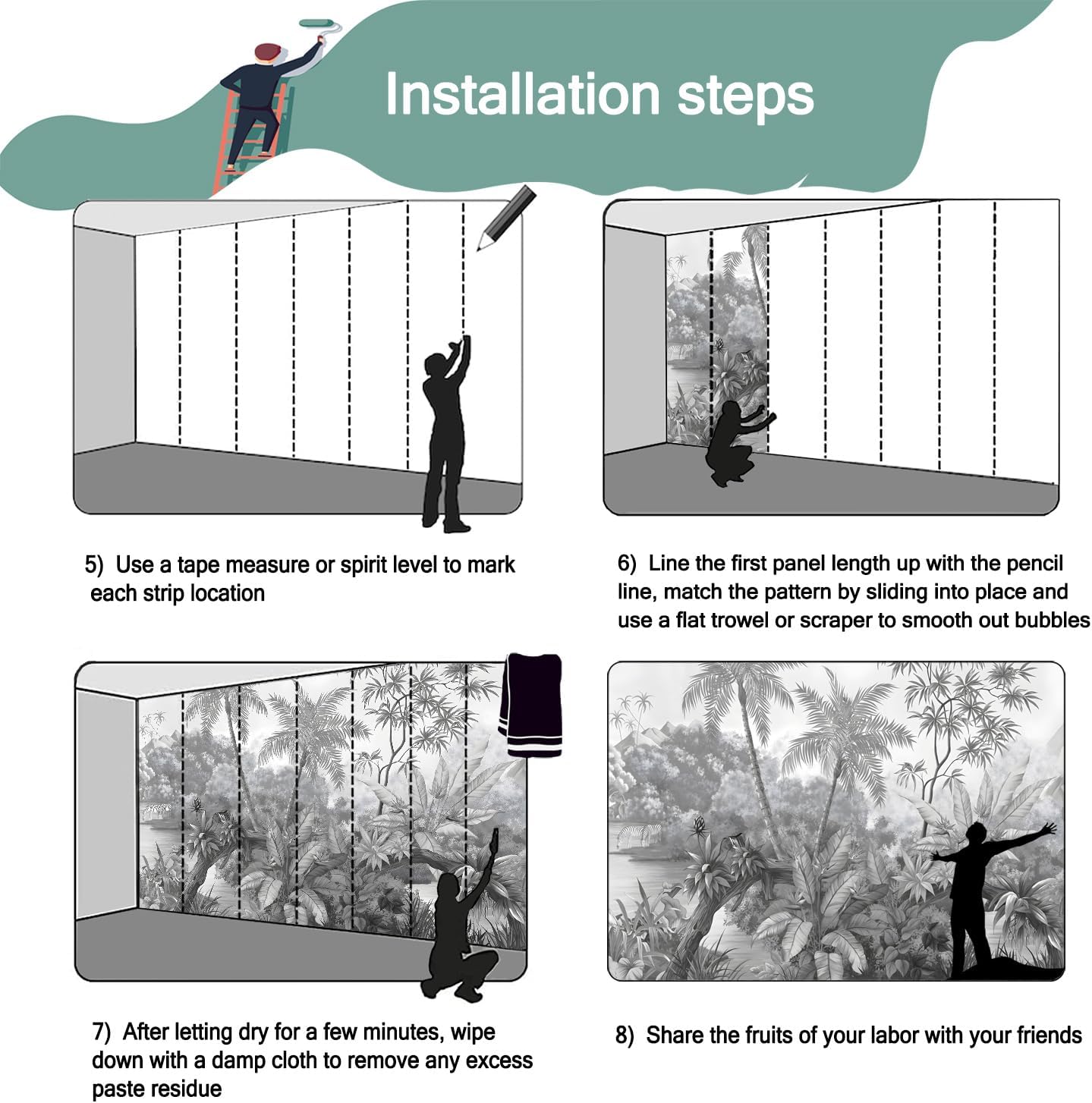 - Mural wallpaper size: 100 "W x 65 "H, divided into 5 sections, each section is labeled with a number underneath, there is no need to overlap the pattern when installing, just install according to the number labeled underneath the panel