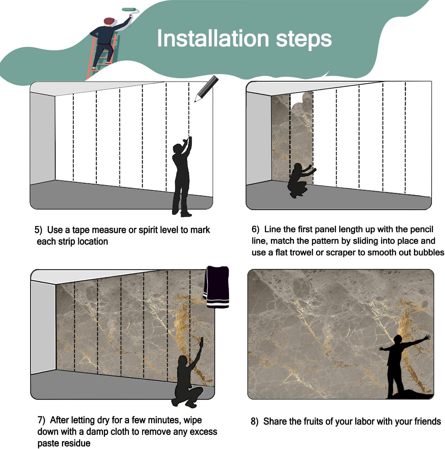 - Mural wallpaper size: 100 "W x 65 "H, divided into 5 sections, each section is labeled with a number underneath, there is no need to overlap the pattern when installing, just install according to the number labeled underneath the panel