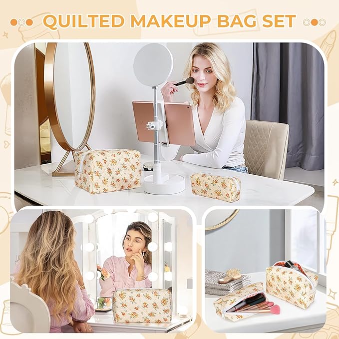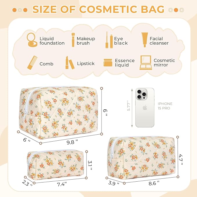 - Quilted Makeup Bag Set:The flower quilted makeup bag set contains two different sizes of makeup bags, 9.8*6*6 inches,8.6*4.7*3.9 inches, 7.4*3.1*2.3 inches. Meet different needs. The large makeup bag is suitable for large cosmetics, skin care products or toiletries; the medium and small makeup bags are perfect for storing makeup brushes, lipsticks and other small cosmetics.