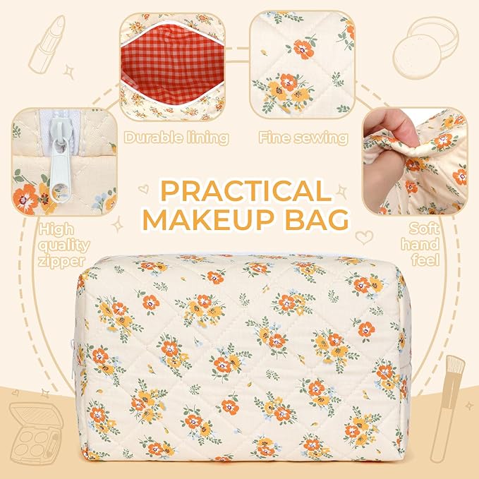 Quilted Makeup Bag Set,Large Floral Cosmetic Pouch For Women,Cute Cotton Brushes Storage Travel Toiletry Organizer Bags(Orange Floral)