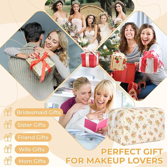- Perfect Gift:Quilted makeup bag set is the perfect gift for friends, girlfriends, bridesmaids, family members, bridesmaids and coworkers. Whether it's a birthday, holiday or special anniversary, its beautiful design and practicality will surprise the recipient. The unique floral pattern and high-grade cotton material make each makeup bag look special and exquisite, making this gift more thoughtful and tasteful.