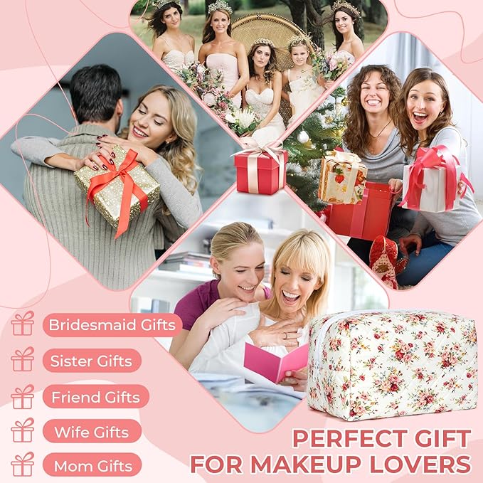 - Perfect Gift:Quilted makeup bag set is the perfect gift for friends, girlfriends, bridesmaids, family members, bridesmaids and coworkers. Whether it's a birthday, holiday or special anniversary, its beautiful design and practicality will surprise the recipient. The unique floral pattern and high-grade cotton material make each makeup bag look special and exquisite, making this gift more thoughtful and tasteful.