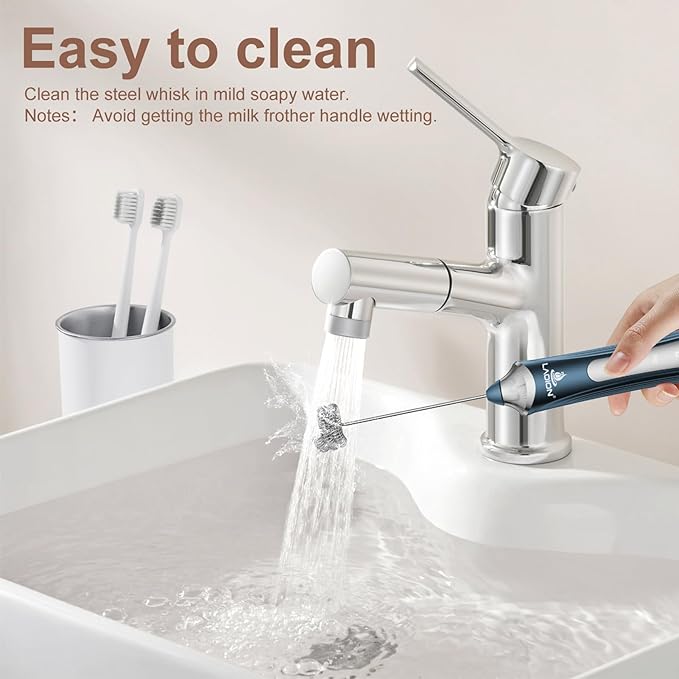 - 【Simple Cleaning and Convenient Storage】The frother comes with two interchangeable whisks, so you'll always have a backup. Cleaning is straightforward—detach the whisk and rinse it under water. For easy storage, we provide a compact stainless steel stand, ensuring your frother is always within reach and your kitchen stays tidy.
