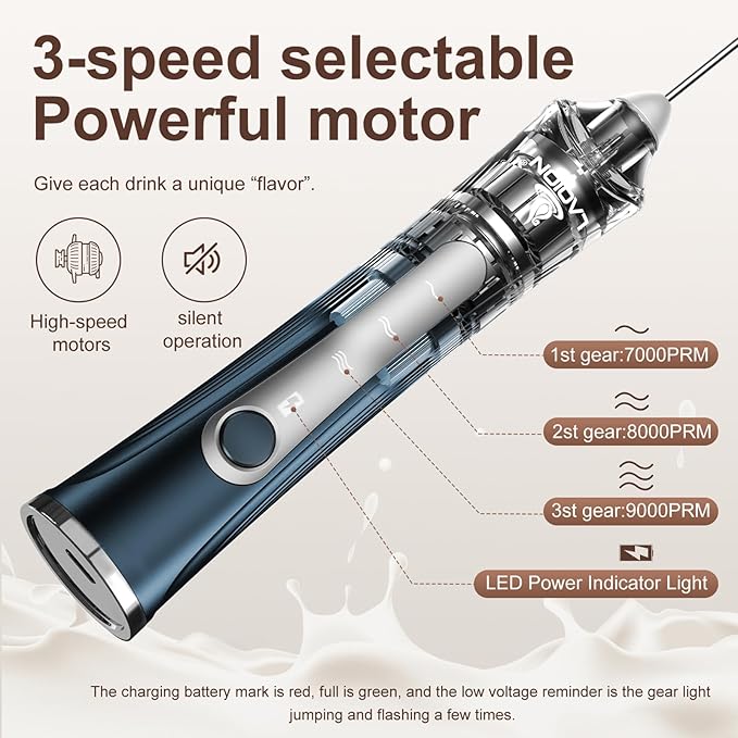 - 【Customizable Froth with Adjustable Speeds】Unlike other frothers, ours offers three speed settings: 7000 RPM, 8000 RPM, and 9000 RPM. Whether you prefer a light froth or a dense foam, you can adjust the speed to match your preference. Our powerful motor ensures you get smooth and creamy froth in just 15 seconds.