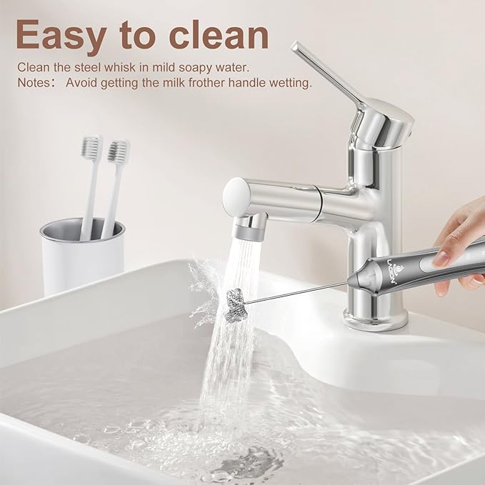 - 【Simple Cleaning and Convenient Storage】The frother comes with two interchangeable whisks, so you'll always have a backup. Cleaning is straightforward—detach the whisk and rinse it under water. For easy storage, we provide a compact stainless steel stand, ensuring your frother is always within reach and your kitchen stays tidy.