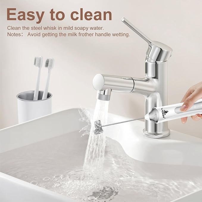 - 【Simple Cleaning and Convenient Storage】The frother comes with two interchangeable whisks, so you'll always have a backup. Cleaning is straightforward—detach the whisk and rinse it under water. For easy storage, we provide a compact stainless steel stand, ensuring your frother is always within reach and your kitchen stays tidy.