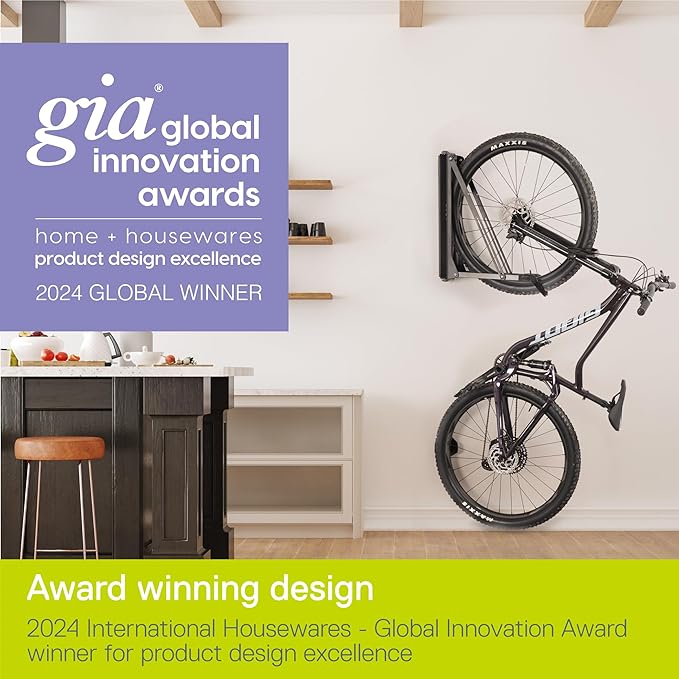 - 3-Pack Black Pivot Rack: This garage bike rack offers a full 150 degrees of swivel in both directions, providing hassle-free access to your bikes while maximizing floor space. International Houseware Association Gia Global Innovation Award winner.