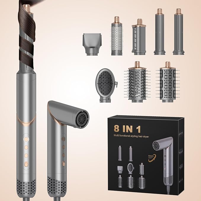- 8 in 1 Rotate Hair Dryer Brush: Rotary hair dryer can be freely switched between hair dryer and styling comb.Our air hair styler set with 8 attachments: 1*hair dryer, 2*left right hair curlers, 1*smoothing comb, 1*double sided mirror comb, 1*curling comb, 2*different size inner buckle comb, and a pair of anti-scald gloves. Locking button can easily switch between attachments and fasten attachments securely