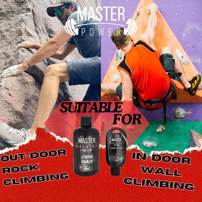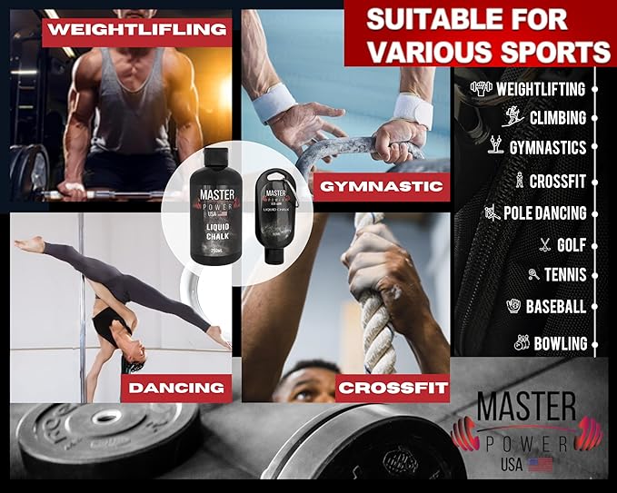 - ✔️IN-DOOR SPORTS: Chalk: Create a liquid grip when Dancing, Doing Gymnastics, Bodybuilders, Bouldering, Powelifters, Pole Dance, Ping-Pong, Bowling, Badminton, Racquetball Squash, and more. ✔️OUT-DOOR SPORTS: MASTER POWER Chalk: Create a liquid grip when Rock Climbing, Tennis, Golf , Padle, Baseball, FootBall, SoftBall, Rugby.