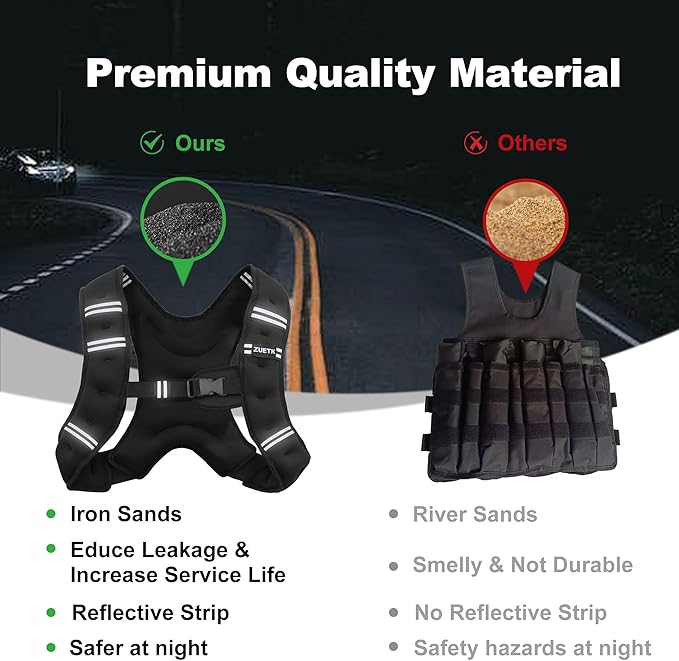 - Adjustable Straps & Reflective Stripes: Each weighted vest has adjustable straps to prevent slipping or sliding, ensuring a better fit for users of all chest sizes and improving exercise efficiency. The reflective strips on both sides of the weighted vest reflect vehicle headlights for safer night running, keeping you away from traffic accidents in any weather conditions (rain, fog, darkness), day or night