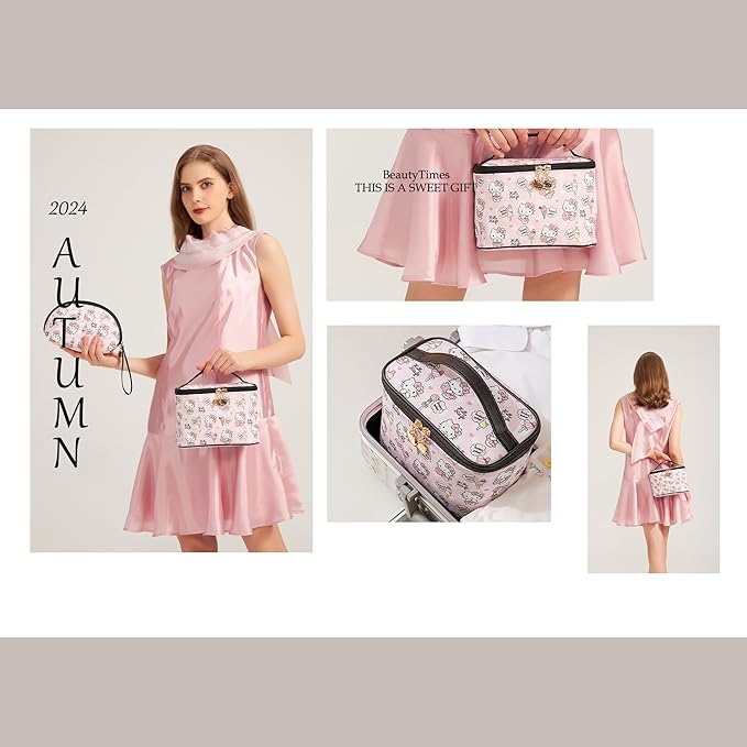 AmBealla Cosmetic Bag Large Makeup Bags Pink Travel Case with Makeup Brush Holder,2PCS Cosmetic Organizer for Women, Toiletry Storage Bag for Skincare & Beauty Tools Sweet Cute for Girls